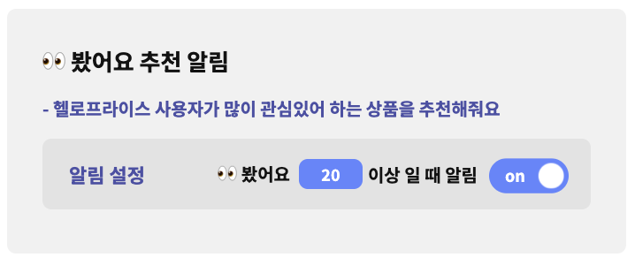 <p><strong>안녕하세요, 헬로프라이스 팀입니다!</strong></p><p><br></p><p>여러 사용자분들의 소중한 의견을 반영하여 업데이트 안내드립니다.</p><p><br></p><h1>1. 👀 봤어요 알림 추가</h1><p><img src="https://cdn.helloprice.co.kr/boards/3424/images/20251004184222/C9F9787695/image.png" alt="image.png" contenteditable="false"><br></p><h3>새로운 <strong>'봤어요' 추천 알림</strong> 기능이 추가되었습니다.</h3><p><br></p><p><img src="https://cdn.helloprice.co.kr/boards/3424/images/20251004184433/42F2874052/IMG_0252BFB6C714-1.jpeg" alt="IMG_0252BFB6C714-1.jpeg" contenteditable="false"><br></p><p><br></p><p><strong>'👀 봤어요'</strong>는 헬로프라이스 사용자가 핫딜을 조회할 때 카운트됩니다.</p><p><br></p><p>이 기능을 설정하시면, 많은 사용자가 관심을 보인 인기 상품의 핫딜 알림을 받을 수 있습니다.</p><p><strong>'봤어요'</strong> 수가 높을수록 좋은 핫딜일 가능성이 높습니다..!</p><p>하지만 알림 기준을 너무 높게 설정하면 이미 종료된 핫딜의 알림을 받게 될 수도 있으니, 적절한 숫자를 설정해 보세요!</p><p><br></p><p><strong>- 현재 모든 사용자는 알림 ON/20개 이상일때로 설정하였습니다.</strong></p><h1>2. 오늘의딜⭐ 업데이트 안내</h1><p><br></p><h3>여러 사용자분들의 소중한 의견을 반영하여</h3><h3>'오늘의 딜⭐ ' 페이지가 새롭게 업데이트되었습니다.</h3><p><br></p><h4>주요 업데이트 내용</h4><p><img src="https://cdn.helloprice.co.kr/boards/3424/images/20251004184222/45C5051FED/스크린샷 2025-10-04 오후 6.38.31.png" alt="스크린샷 2025-10-04 오후 6.38.31.png" contenteditable="false"><br></p><p><br></p><ul><li><p><strong>정렬 기능 추가</strong>: 이제 '추천수/댓글수/봤어요 많은 순'으로 핫딜을 정렬하여 볼 수 있습니다. 각종 커뮤니티에서 가장 인기 있는 핫딜을 한눈에 확인해 보세요.</p></li><li><p><strong>시간별 조회 기능 추가</strong>: 특정 시간 내에 올라온 핫딜만 모아 볼 수 있는 기능이 추가되었습니다. 원하는 시간대의 핫딜만 간편하게 확인하세요.</p></li></ul><p><br></p><h4><strong>TIP:</strong></h4><p><img src="https://cdn.helloprice.co.kr/boards/3424/images/20251004184222/C5D75F5F29/image.png" alt="image.png" contenteditable="false"><br></p><p><br></p><p><br></p><p><strong>'현재 설정을 오늘의딜⭐ 기본 검색 조건으로 변경할까요?'</strong> 기능을 사용하시면,</p><p>지금 설정하신 정렬 및 시간 조건이 앱 실행 또는 '오늘의 딜' 페이지 접속 시 항상 기본값으로 적용됩니다.</p><p>더욱 편리해진 '오늘의 딜<strong>⭐</strong>'을 지금 바로 경험해 보세요!</p><p><br></p><p><br></p><p><br></p><p><strong>앞으로도 여러분의 의견에 귀 기울이며 더 나은 서비스를 만들어 가겠습니다.</strong></p><p><br></p><p><strong>감사합니다.</strong></p><p><br></p>