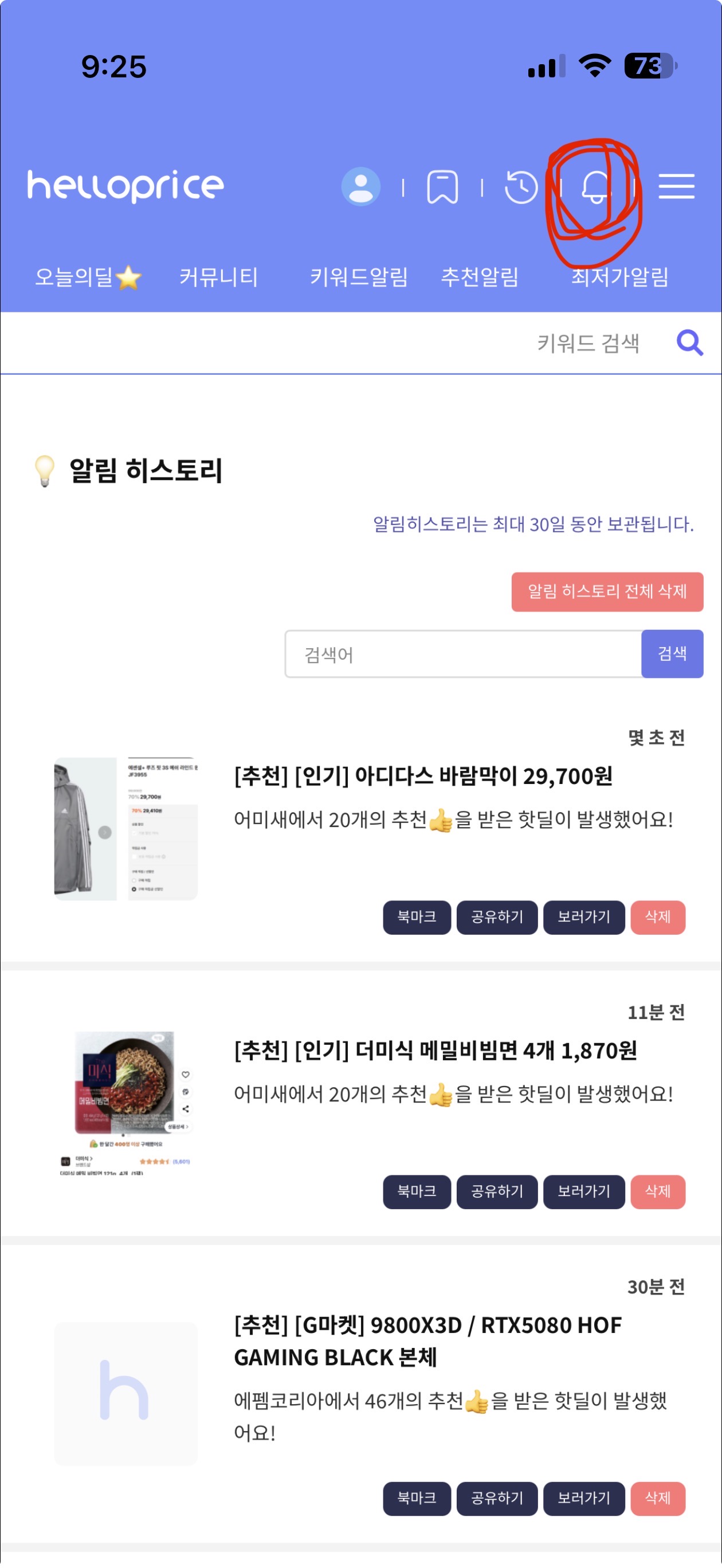 <p>좋은 앱 잘 쓰고 있습니다.</p><p><br></p><p>알림 히스토리 화면에서</p><p>상단 알림 버튼 한번 더 누르면 화면 리프레시되게 바꿔주세요</p><p><br></p><p>감사합니다<img src="https://cdn.helloprice.co.kr/boards/3434/images/20251104092914/616C749CB7/IMG_0175.jpeg" alt="IMG_0175.jpeg" contenteditable="false"><br></p>